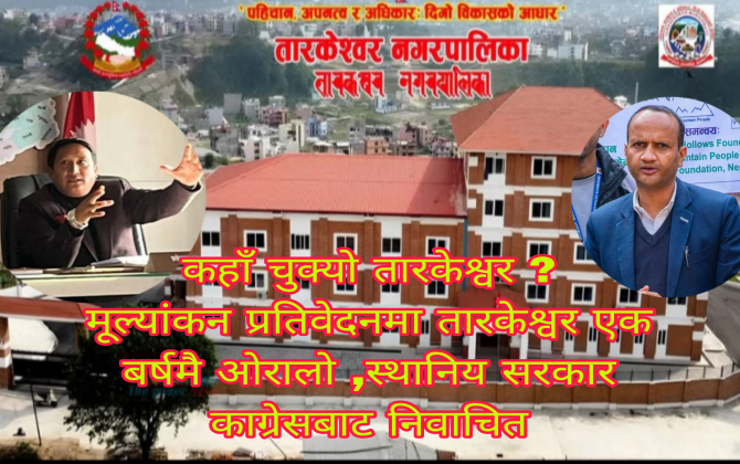 राष्ट्रिय प्राकृतिक स्रोत तथा वित्त आयोगले सार्वजनिक गरेको स्थानीय तहको कार्यसम्पादन मूल्यांकन प्रतिवेदनले तारकेश्वर नगरपालिकालाई ५९.२९ अंकमा सीमित गरेको छ। एक वर्षअघिसम्म ८५ अंक पार गरी ‘उत्कृष्ट’ सूचीमा रहेको नगरपालिकाको यो गिरावटले नेतृत्व, प्रशासन र राजनीतिक प्रतिबद्धतामाथि नै गम्भीर प्रश्न उठाएको छ। नेपाली कांग्रेसबाट निर्वाचित नगरप्रमुख कृष्णहरि महर्जन र उपप्रमुख सृजना बुर्लाकोटीको नेतृत्वमा रहेको तारकेश्वर…...