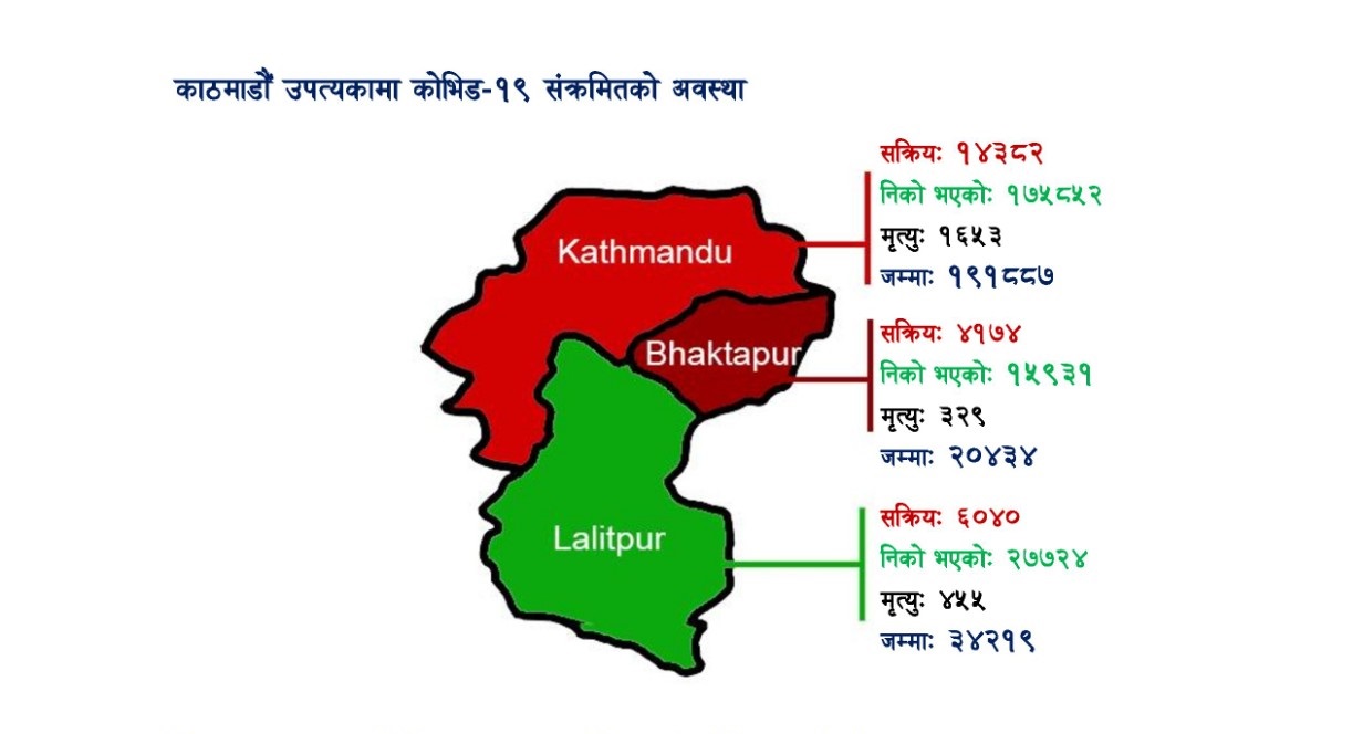स्वास्थ्य तथा जनसंख्या मन्त्रालयका अनुसार काठमाडौँमा १ हजार ६३० जना, भक्तपुरमा १२९ जना र ललितपुरमा २९८ जना कोरोना संक्रमित थपिएका हुन्