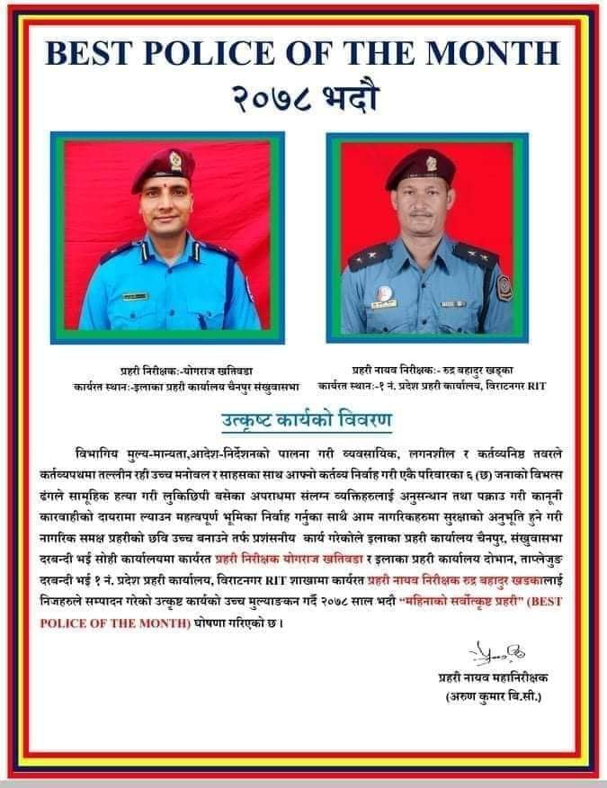 विभागिय मुल्य-मान्यता,आदेश-निर्देशनको पालना गरी व्यवसायिक, लगनशील र कर्तव्यनिष्ठ तवरले कर्तव्यपथमा तल्लीन रही उच्च मनोवल र साहसका साथ आफ्नो कर्तब्य निर्वाह गरी एकै परिवारका ६ (छ) जनाको विभत्स ढंगले सामूहिक हत्या गरी लुकिछिपी बसेका अपराधमा संलग्न व्यक्तिहरुलाई अनुसन्धान तथा पक्राउ गरी कानूनी कारवाहीको दायरामा ल्याउन महत्वपूर्ण भूमिका निर्वाह गर्नुका साथै आम नागरिकहरुमा सुरक्षाको अनुभूति हुने गरी नागरिक समक्ष प्रहरीको छवि उच्च बनाउने तर्फ प्रशंसनीय कार्य गरेकोले इलाका प्रहरी कार्यालय चैनपुर, संखुवासभा दरबन्दी भई सोही कार्यालयमा कार्यरत प्रहरी निरीक्षक योगराज खतिवडा र इलाका प्रहरी कार्यालय दोभान, ताप्लेजुङ दरबन्दी भई १ नं. प्रदेश प्रहरी कार्यालय, विराटनगर RIT शाखामा कार्यरत प्रहरी नायव निरीक्षक रुद्र बहादुर खडकालाई उनीहरुले गरेको उत्कृष्ट कार्यसम्पादनको उच्च मुल्याङकन गर्दै २०७८ साल भदौ “महिनाको सर्वोत्कृष्ट प्रहरी” (BEST POLICE OF THE MONTH) घोषणा गरिएको छ ।