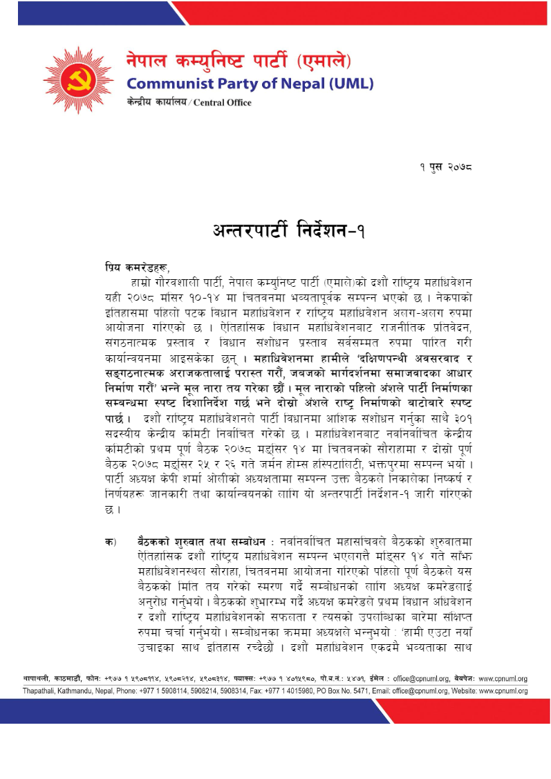 एमालेले अन्तर्पार्टी निर्देशन (अपानि) जारी गर्दै विभिन्न विभागका प्रमुखका साथै प्रदेश र जिल्ला इञ्चार्जहरु पनि तोकेको छ ।