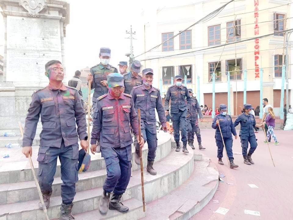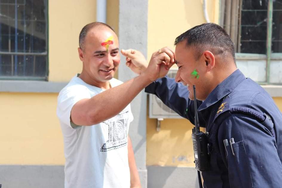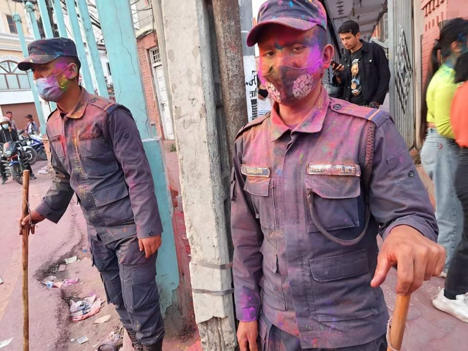 होलिको सुरक्षामा खटिएका प्रहरीहरुलाई सर्वसाधारणले रङ दलेर रमाइलो माहोल