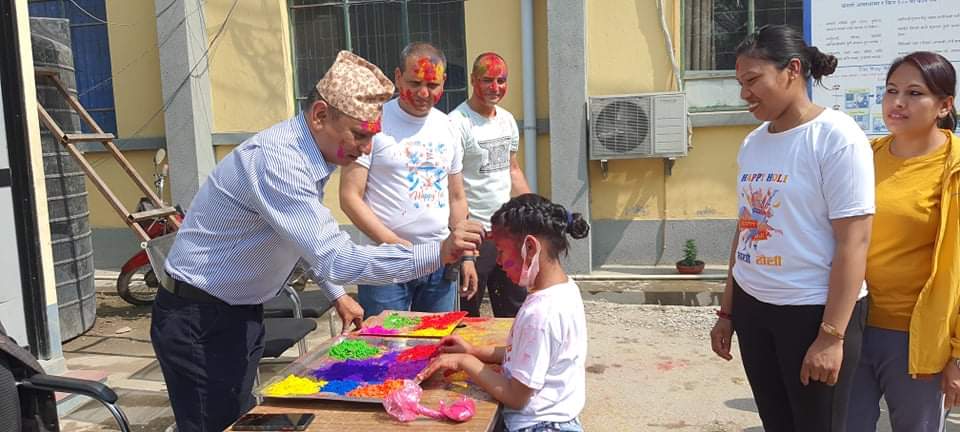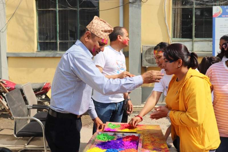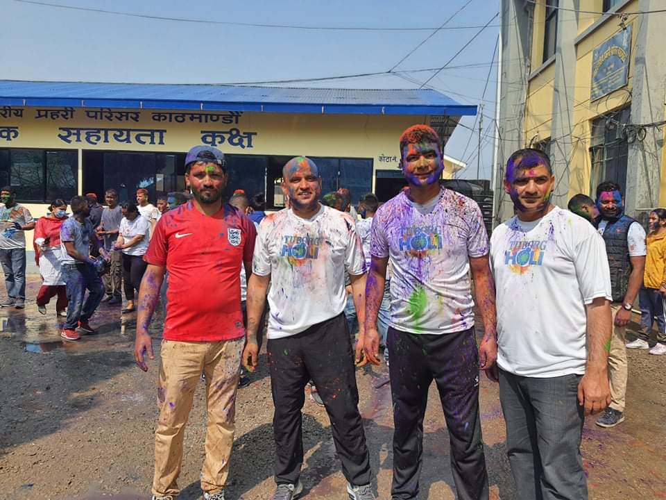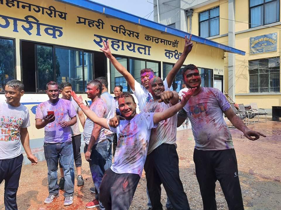 बिहीबार महानगरीय प्रहरी परिसर काठमाडौंका प्रहरी वरिष्ठ उपरीक्षक सुदीप गिरीले टेकुमा कार्यरत सम्पुर्ण प्रहरी कर्मचारीहरूलाई टिका र रङ्ग लगाइदिदैं असत्यमाथि सत्यको जित भएको यस पर्वकाे अवसरमा आफ्नो मनमा रहेको नराम्रो भावना फालेर राम्रो दिनको सुरुवात गर्न प्रेरणा मिलोस भन्ने शुभकामना दिदैं होली मनाएका थिए ।