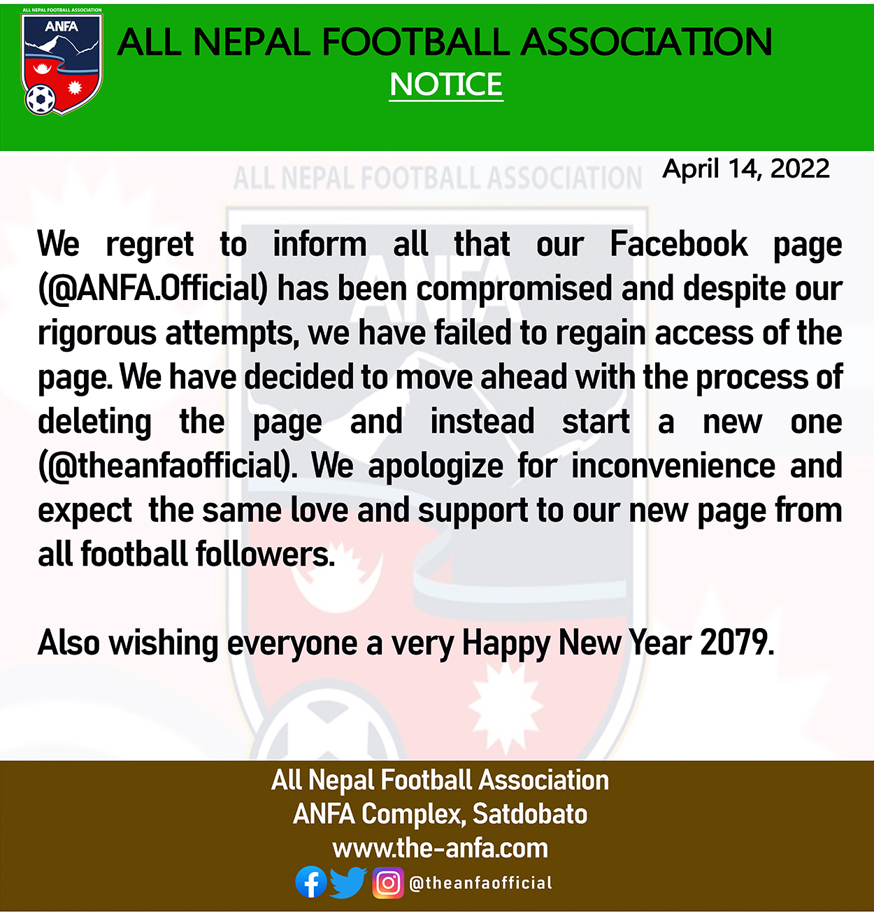 पेज यसअघि समेत ह्याक गर्ने प्रयास गरिएको थियो । तर यसपटक भने एन्फाले पेज फर्काउन नसकिएको र नयाँ पेज खोलिने जनाएको छ ।