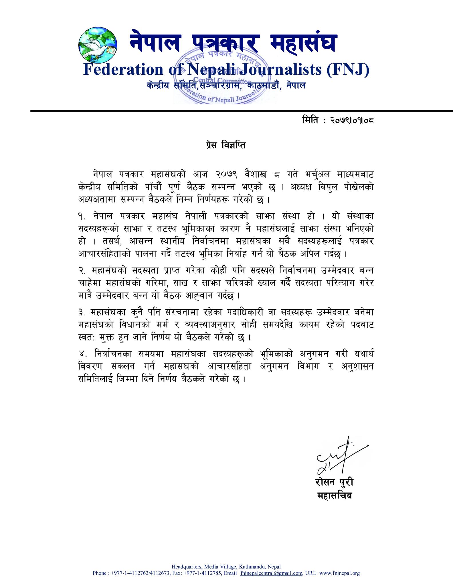 ०८ बैशाख , काठमाडौं । नेपाल पत्रकार महासंघले ३० बैशाखमा हुने स्थानीय तहको निर्वाचनमा उम्मेदवार बन्नेले महासंघको सदस्यता त्याग्न आग्रह गरेको छ ।