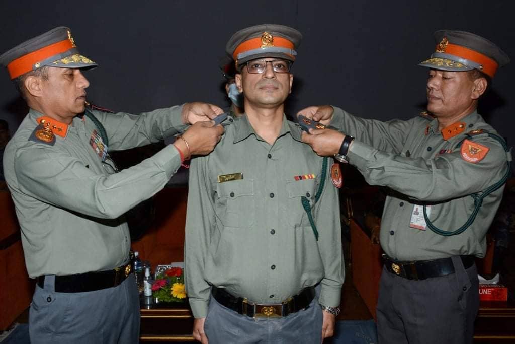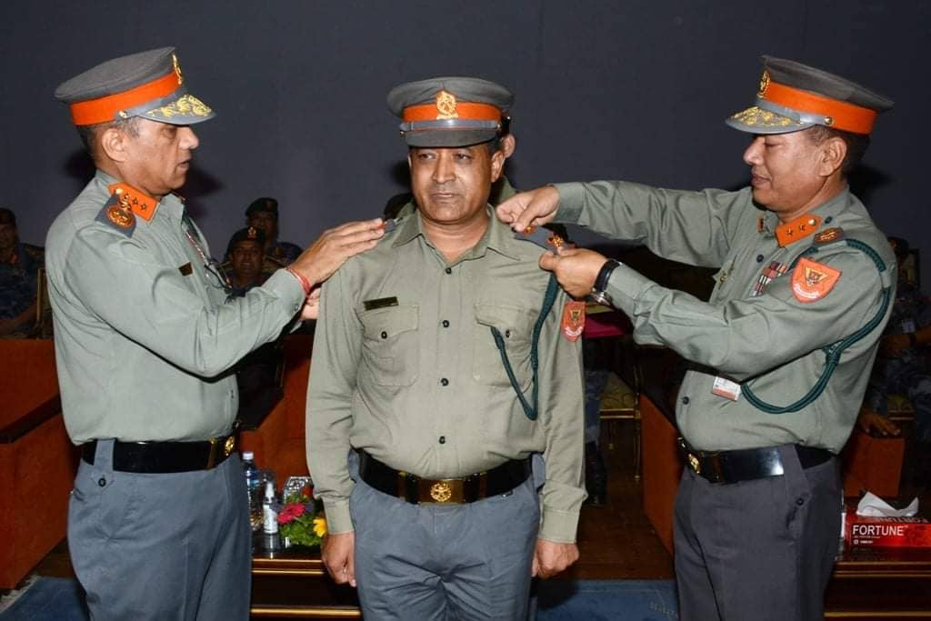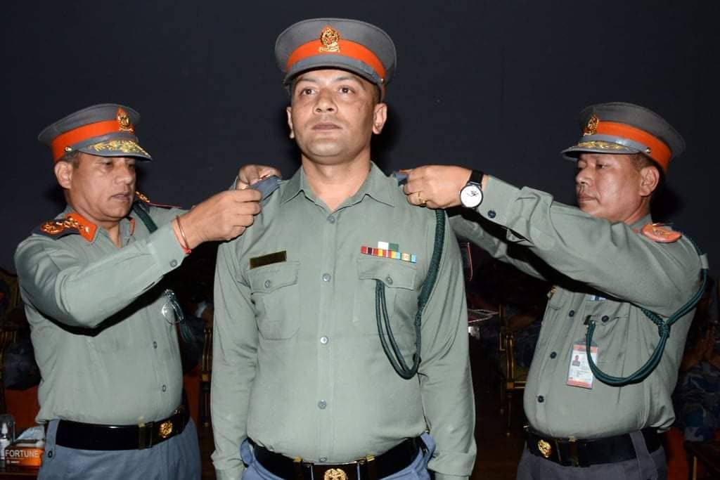 १६ वैशाख , काठमाडौ । सशस्त्र प्रहरी महानिरीक्षक पुष्पराम के.सी ले सशस्त्र प्रहरी बल नेपाल प्रधान कार्यालय हल्चोक स्वयम्भूमा बैशाख १५ गते आयोजित एक समारोहकाबीच सशस्त्र प्रहरी निरीक्षकबाट सशस्त्र प्रहरी नायव उपरीक्षक पदमा पदोन्नती हुनुभएका ७२ जना अधिकृतहरुलाई उल्लेखित दर्जाको दर्ज्यानी चिन्ह प्रदान गर्नुभयो ।