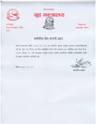 गृह मन्त्रालयका प्रवक्ता फणिन्द्रमणि पोखरेलद्वारा जारी गरेको विज्ञप्ति अनुसार इद उल फित्रका अवसरमा बिदा दिइएको हो ।