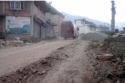 विसं २०७२ मा ठेक्का भएको यो सडक अझै बन्न सकेको छैन । निर्माण व्यवसायीले महिनामा एक दिन काम गर्ने अनि बन्द गर्ने गरेकाले काममा ढिलाइ भएको हो । तस्बिर : पूर्णप्रसाद मिश्र