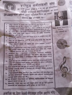 थप अध्यक्ष बिक्रम जंग शाह (सानुकान्छा) जितेर आएपछि संघका निम्ति काम गर्छु भन्दै यस्तो प्रतिबद्धता पनि पेश गरेका थिए तर काम भने नभएको आकलन गर्न सकिन्छ । यसो भइरहदा राष्ट्रिय संङ्गीतकर्मी संघमा कतै लूटतन्त्र चलेकोत होइन भन्ने संगठन भित्र चलेको छ ।