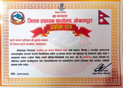 ‘नेपाल सरकारले स्थानीय तहको निर्वाचन घोषणा गरेपश्चात उच्च मनोबलका साथ अहोरात्र फिल्डमा खटिएर सुरुदेखि नै आफ्नो कर्तव्य निर्वाह गरेर स्थानीय तहको निर्वाचनलाई सफल रुपमा शान्तिपूर्ण रुपमा, स्वच्छ वातावरणमा सम्पन्न गर्न महत्वपूर्ण भूमिका निर्वाह गर्नु भएको हुनाले जिल्ला स्थित सम्पूर्ण सुरक्षा निकायका प्रमुखलाई प्रशंसा पत्र सहित सम्मान गरिएको हो ।