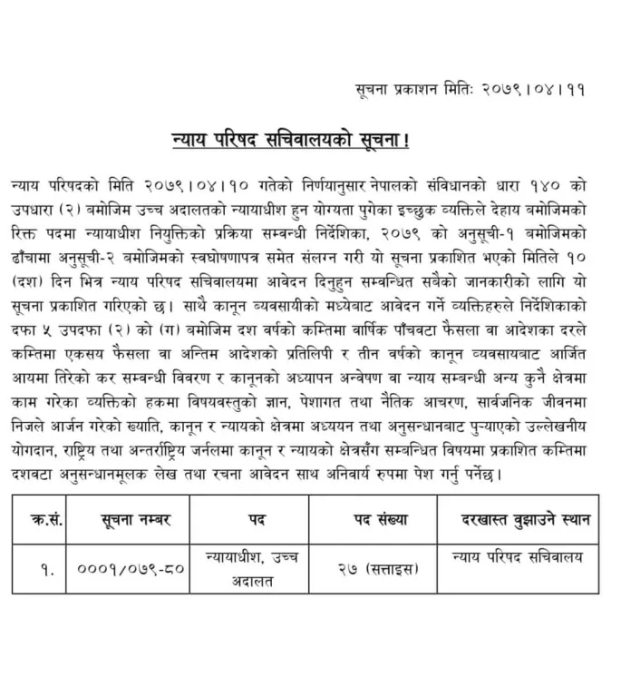 ११ साउन , काठमाडौं । न्याय परिषद्ले २७ जना उच्च अदालतका न्यायाधीशका लागि आवेदन माग गरेको छ । आज सूचना प्रकाशित गरी परिषदले योग्यता पुगेकाहरूले १० दिनभित्र आवेदन दिन आह्वान गरेको हो ।