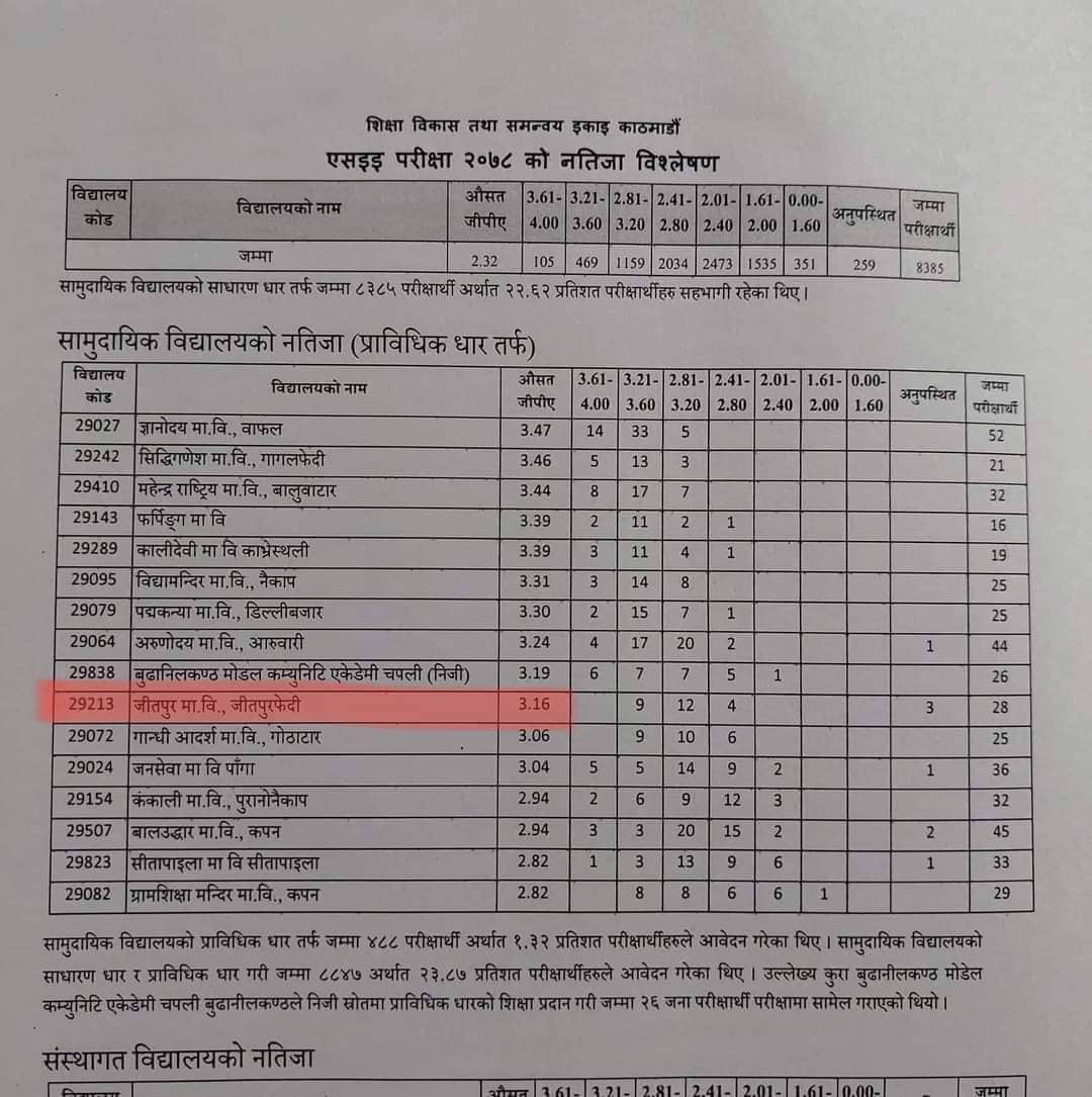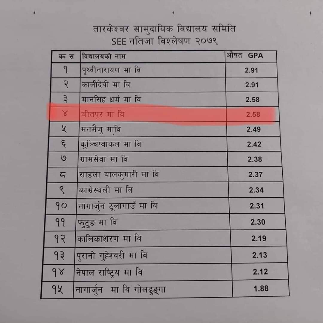 १९ साउन , काठमाडौं । काठमाडौकाे उत्तरी भेगस्थित रहेका स्कुलहरुमध्ये तारकेश्वर नगरपालिका तथा काठमाण्डौ जिल्ला निर्वाचन क्षेत्र नम्बर ७ कै एक मात्र प्राविधिक धार तर्फको सिभिल इन्जिनियरिङ विषयको पढाई हुने विद्यालय श्री जितपुर माध्यमिक विद्यालयले शैक्षिक सत्र २०७८ को माध्यमिक शिक्षा परीक्षा (SEE) को नतिजा उत्कृष्ट ल्याउन सफल भएकोमा तारकेश्वर नगरपालिकाभित्रका सामुदायिक विद्यालयमा ४ औं स्थान र काठमाण्डौ जिल्लाको प्राविधिक विद्यालयहरुमा १० औं स्थानपर्न सफल भएका छ ।