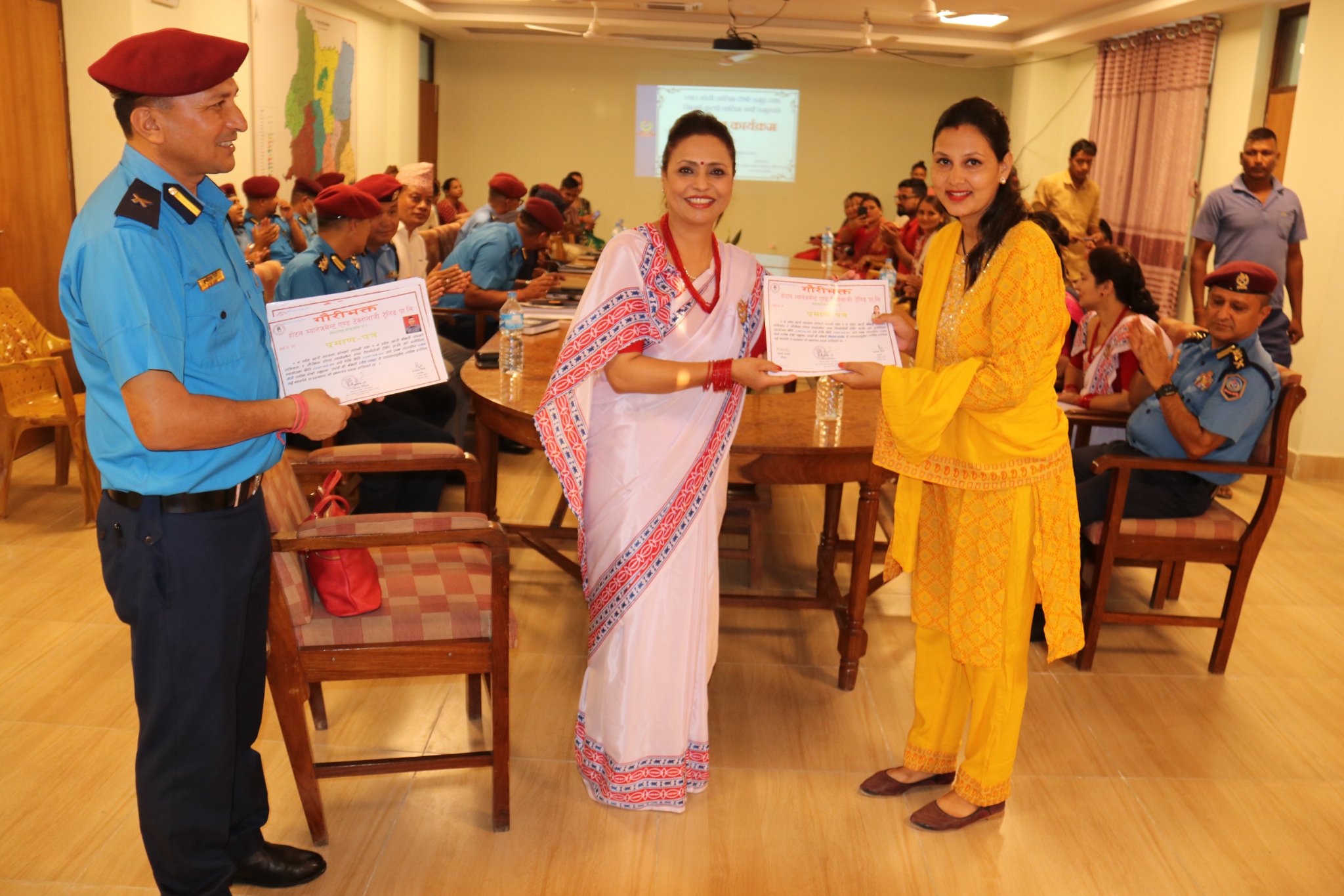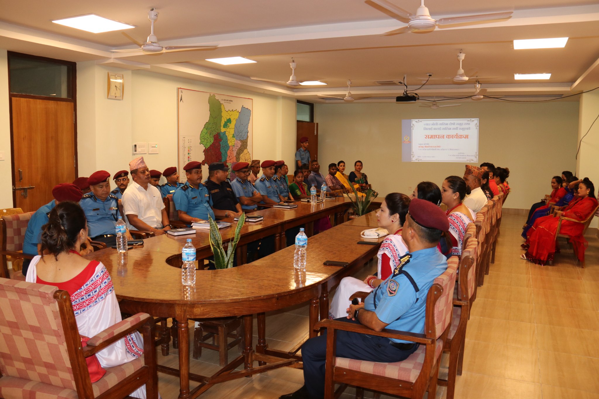 नेपाल प्रहरीका बहालवाला तथा पुर्व प्रहरी परिवारजनका १०/१० जनाको सहभागीता रहेको सिलाई कटाई र च्याउ खेती तालिमको प्रदेश प्रहरी श्रीमती संघकी अध्यक्ष कल्पना गिरीको प्रमुख आतिथ्यतामा प्रदेश प्रहरी कार्यालयको सभाहलमा आयोजित एक बिशेष कार्यक्रमका बिच तालिमको समापन कार्यक्रम सम्पन्न भएको हो ।