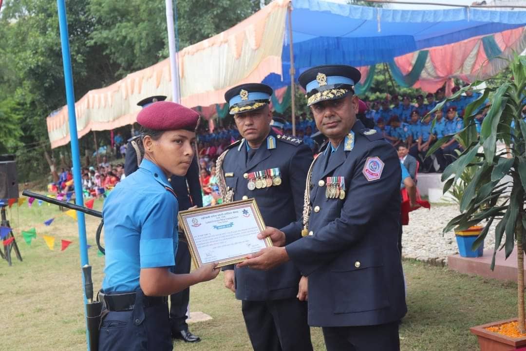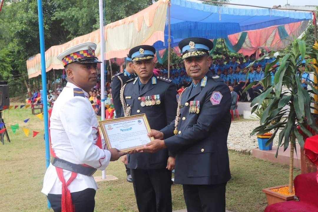तालिममा विभिन्न विधामा उत्कृष्ट स्थान हासिल गर्ने प्रशिक्षार्थीहरु तथा तालिममा खटिएका उत्कृष्ट प्रशिक्षकहरुलाई प्रहरी नायव महानिरीक्षक उपाध्यायद्धारा पुरस्कृत गरिएको थियो । पुरस्कार वितरण पश्चात दिक्षित भई जान लागेका प्रशिक्षार्थीहरुलाई निर्देशन सम्बोधन गर्दै उहाँले तालिम अवधीमा हासिल गरेका ज्ञान, सिप र कौशललाई कार्यक्षेत्रमा ईमान्दारीपूर्वक लागू गर्न सके मात्र तालिमको उपादेयता पुरा हुने बताउनुभयो ।