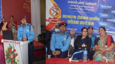 नेपाल प्रहरीको समुदाय-प्रहरी-साझेदारी कार्यक्रम अन्तर्गत काभ्रेपलापञ्चोक जिल्लाको बनेपा नगरपालिका वडा नं. ०५ स्थित अरनिको पार्टी प्यालेसको सभा हलमा जिल्ला प्रहरी कार्यालय काभ्रेको आयोजनामा काभ्रेका प्रमुख प्रहरी उपरीक्षक चक्रराज जोशी तथा काभ्रेकी प्रमुख जिल्ला अधिकारी हुमकला पाण्डेको प्रमुख आतिथ्यतामा आत्महत्या रोकथामका लागि सचेतना कार्यक्रम सम्पन्न भएको छ ।