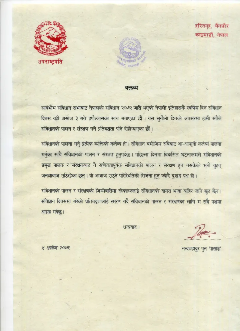 ‘पछिल्ला दिनमा विकसित घटनाक्रमले संविधानको प्रमुख पालक र संरक्षकबाट नै सचेततापूर्वक संविधानको पालन र संरक्षण हुन नसकेको भनी वृहत् जनआवाज उठिरहेका छन् । यो आवाज उठ्ने परिस्थितिको सिर्जना हुनु ज्यादै दुःखद पक्ष हो,’ उपराष्ट्रपतिले विज्ञप्तिमा भनेका छन्, ‘संविधानको पालन र संरक्षणको जिम्मेवारीमा रहेकाहरूलाई संविधानको दायरा भन्दा बाहिर जाने छुट छैन । संविधान दिवसमा गरेको प्रतिबद्धतालाई स्मरण गर्दै संविधानको पालन र संरक्षणका लागि म सबै पक्षमा आग्रह गर्दछु ।’