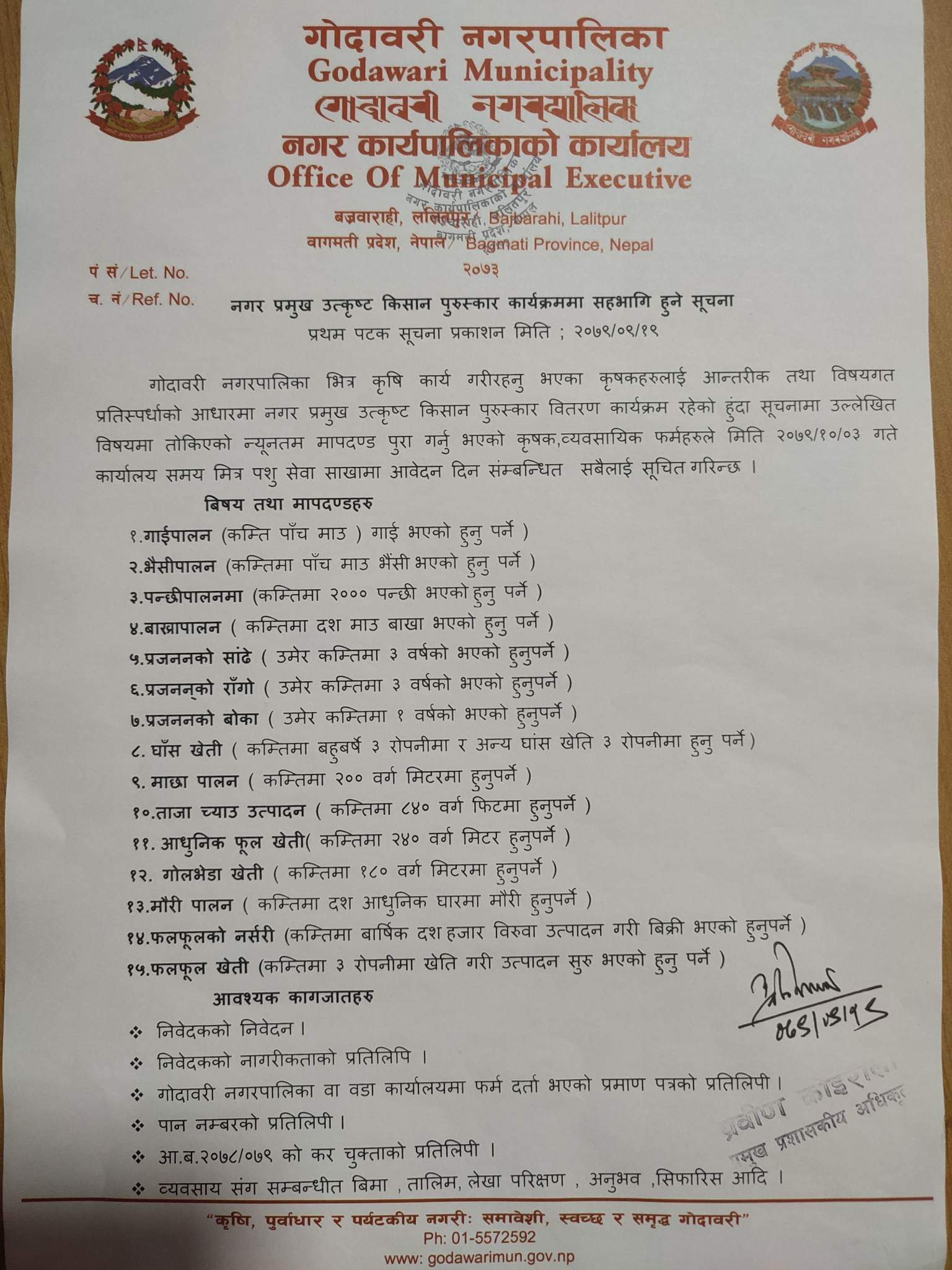 नाेट : माथि लेखिएका मापदण्डअनुसार आवश्यक पर्ने कागजातहरु नियमित हुनुपर्ने साथै निवेदकको नागरीकताको प्रतिलिपि * गोदावरी नगरपालिका वा वडा कार्यालय फर्म दर्ता भएको प्रमाण पत्रको प्रतिलिपी * पान नम्बरको प्रतिलिपी अादि चाहिने छ ।