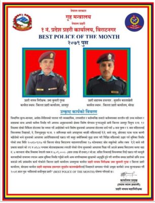 त्यस्तै, मिति २०७९ पुस २७ गते मोरङको विराटनगर-७ जलजला चौक स्थितबाट विराटनगर महानगरपालिका-१७ का रवी प्रकाश साहलाई श्रोत नखुलेको नेपाली रकम ७ लाख ९ हजार र को.२९ प ७९८४ नम्वरको मोटरसाइकलसहित पक्राउ गरी कानूनी कारवाहीको दायरामा ल्याउन अहम भूमिका निर्वाह गर्नुको साथै आम नागरिकहरुमा सुरक्षाको अनुभूति हुने गरी नागरिक समक्ष प्रहरीको छवि उच्च बनाउने तर्फ प्रशंसनीय कार्य गरेकोले दुबै जनालाई निजहरुले सम्पादन गरेको उत्कृष्ट कार्यको उच्च मुल्याङकन गर्दै २०७९ साल पुस महिनाको सर्वोत्कृष्ट प्रहरी घोषणा गरिएको हो ।
