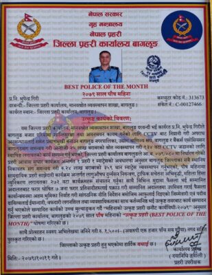 जिल्ला प्रहरी कार्यालय बागलुङले आफ्नो कार्यालय मातहत कार्यरत प्रहरी कर्मचारीको कार्यसम्पादनको आधारमा इन्स्पेक्टर गिरीलाई पुस महिनाको सर्वोत्कृष्ट प्रहरी घोषणा गरेको हो ।