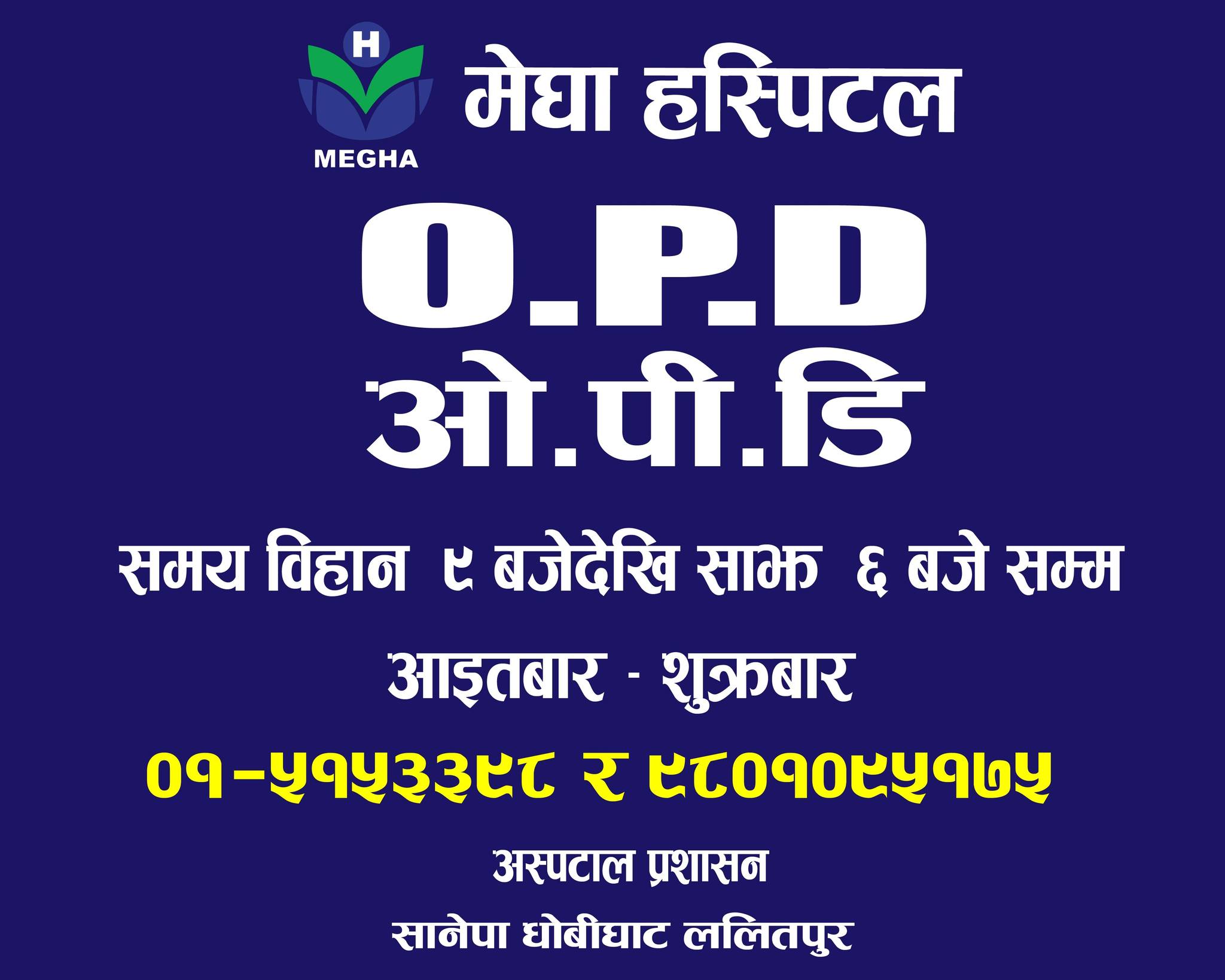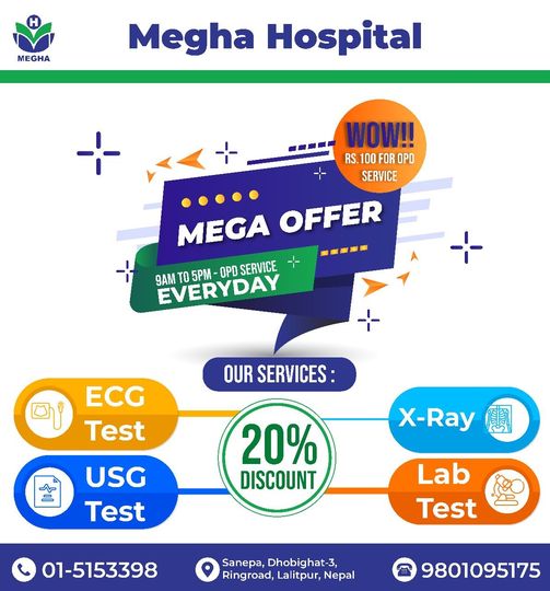 ५ फागुन , काठमाडौ । ललितपुरको धोबिघाट-३ मा रहेको मेघा अस्पताल ले प्रत्येक रोगको उपचारमा २०% देखी ४०% सम्म डिस्काउनको व्यवस्था ल्याएको छ ।