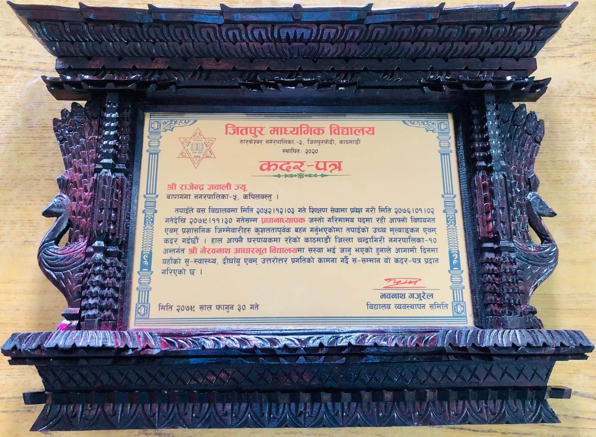 काठमाडौंको उत्तरी भेगमा रहेको २८ वर्षदेखि काठमाण्डौ तार्केश्वर नगरपालिका-३, जितपुरफेदीमा अवस्थित जितपुर माध्यमिक विद्यालयमा शिक्षण गर्दै मिति २०७६।०१।०२ देखि प्रधानाध्यापक जस्तो गरिमामय पदमा रही जितपुर विद्यालयको प्रगति मार्ग कोर्न सफल बनेका राजेन्द्र ज्ञवाली आज स्कुलबाट बिदाई भएका हुन् ।