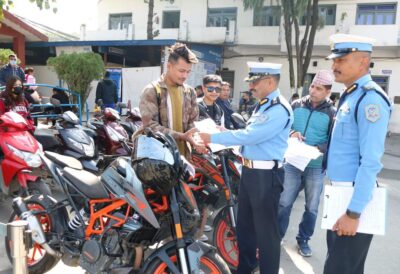 रामशाहपथ स्थित काठमाडौँ उपत्यका ट्राफिक प्रहरी कार्यालयमा आयोजित एक कार्यक्रमका बिच ट्राफिक कार्यालयका प्रवक्ता प्रहरी वरिष्ठ उपरीक्षक राजेन्द्र प्रसाद भट्टले १२ ओटा मोटरसाइकल र ६ ओटा स्कुटर धनीलाई हस्तान्तरण गर्नुभएको हो ।