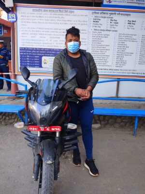 वास्तविक नम्बर परिवर्तन गरी बागमती प्रदेश ०२–०३८ प ६७१६ नम्बर राखी चलाइरहेको अवस्थामा काठमाडौं उपत्यका ट्राफिक प्रहरी कार्यालयमा रहेको पीडित सहायता इकाइबाट खटिएको टोलीले मोटरसाइकलसहित फेला पारी चोरीमा संलग्न तामाङलाई टोखाबाट सोमबार नियन्त्रणमा लिएको हो ।