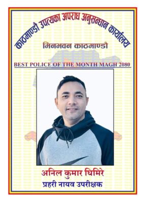 काठमाडौं । काठमाडौं उपत्यका अपराध अनुसन्धान कार्यालयले प्रहरी नायब उपरीक्षक अनिल घिमिरेलाई माघ महिनाको सर्वोत्कृष्ट प्रहरी घोषित गरेको छ ।