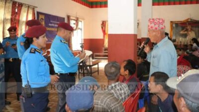 कार्यक्रमका सहभागीले उठाएका प्रश्नको जवाफ दिदै जिल्ला प्रहरी परिसर प्रमुख खत्रीले राज्यले प्रदान गरेको अभिभारा पूरा गर्न नेपाल प्रहरी संगठनले व्यावसायिक निष्ठाका साथ अधिकतम प्रयास गर्दै आएको बताए ।